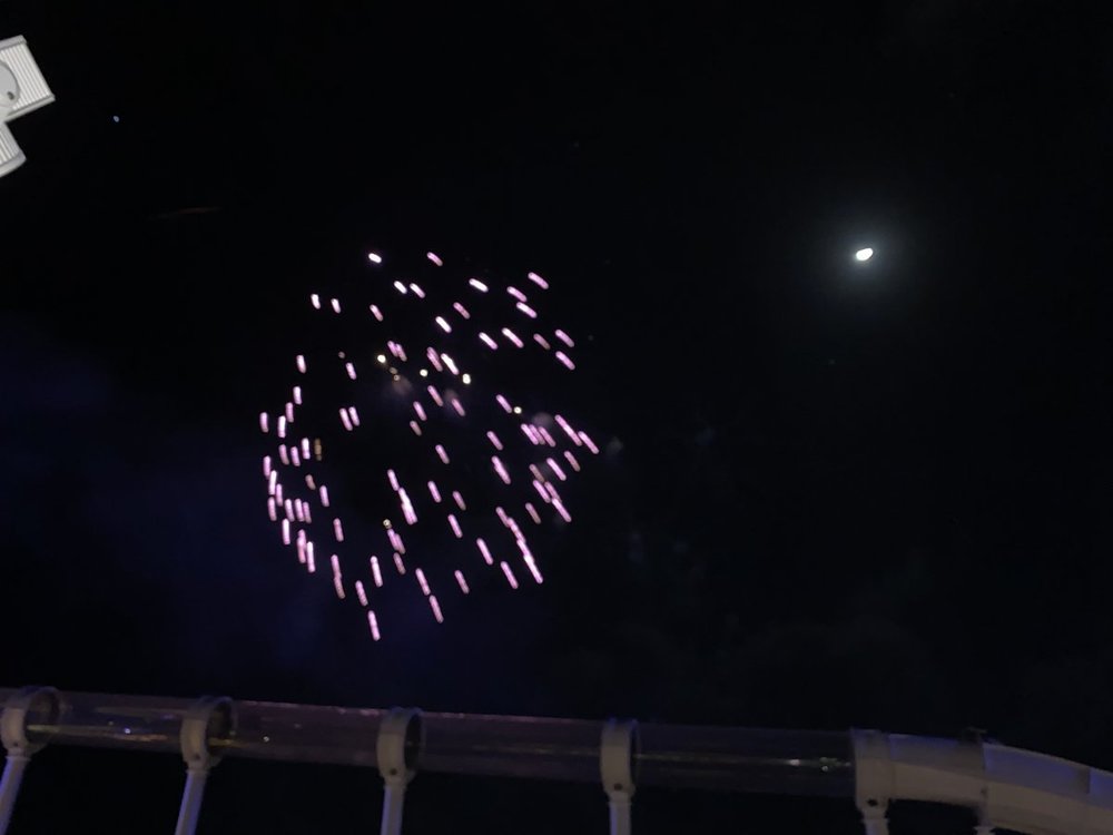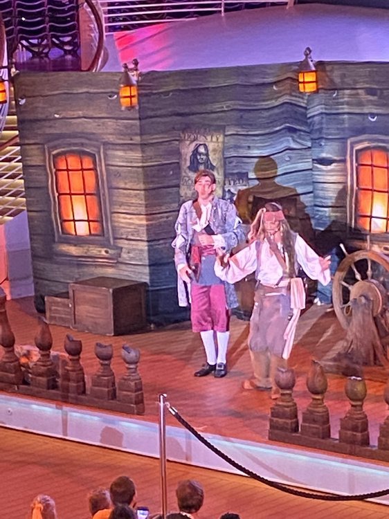 Dinner was at the third restaurant in our rotation, Enchanted Garden. I liked the theming the best in this restaurant as it had a great garden feel including a fountain in the center of the dining room and Lightbulb flowers that opened up after sunset which was during our main seating time. There were some cool looking booths for small parties. I thought the menu was a little more mainstream in this venue compared to the Royal court which was more French gourmet. Apparently there is Pirate themed menus but because we had a Star Wars Day at sea we had a themed dinner that night instead. Pirate’s Night encourages you to explore the Pirates life. Pirate bandannas were provided to each guest and you were encouraged to wear pirate themed clothing or full pirate costumes that evening around the ship including to dinner. There was an evening show up on the pool deck after both dinner seatings. They are able to cover the pools providing more deck space to gather for the festivities. There are some pirate songs and Captain Jack Sparrow makes an appearance. Fireworks complete the pirate themed activities. We skipped the evening entertainment which was an illusionist with some comedy. I had a chance to see a preview of his show on the first night during the evening entertainment. He was good but we took time to get photos in our costumes instead.1 point